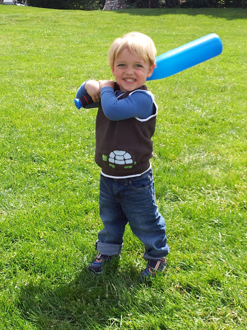 I did my best to teach Luke the basics-grip, stance, knees bent (courtesy of my Dad-that and “Whatever you do, don’t cry if you strike out.”) and eyes on the ball. My plan was to not mention this to Brian until he arrived at home and could see it, but one evening, during a Skype date, Luke started talking about it. When I couldn’t take the confusion anymore, I finally explained to my visibly disappointed husband, that I had unearthed the bat. After the initial shock was over, he asked Luke to show him. So Luke got his first real lesson through the magic of Skype. As I expected, on Brian’s first day off after arriving home, he bought Luke his first “real” bat (whiffle) and we went to the park. Luke pitched to both of us, we each pitched to him (he is still working on his grip), and then he played manager for a bit and directed us (“Go get that ball. Throw it. Hit it.”)